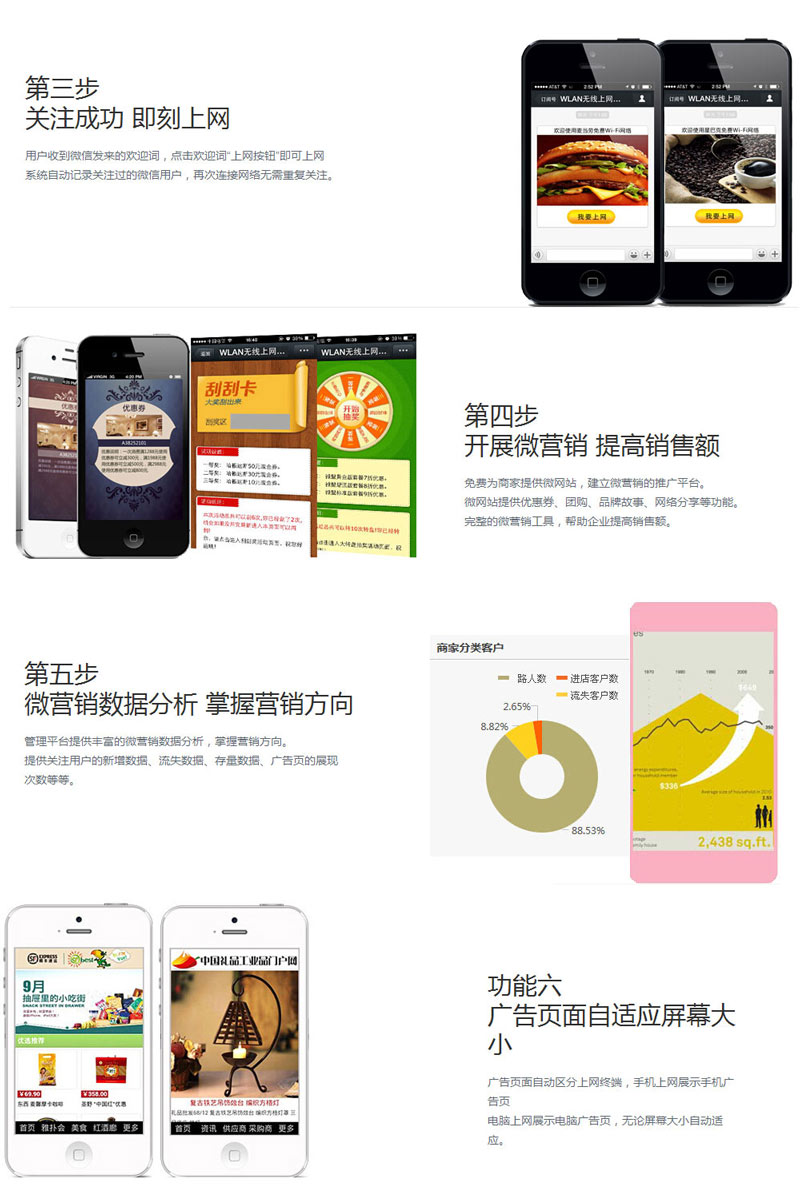 當(dāng)越來越多的企業(yè)在微信上建立公共賬號(hào)時(shí),我們可以發(fā)現(xiàn)微信以迅猛之勢(shì)滲透到我們生活中的每個(gè)角落,可以說微信的前景被普遍看好。在此背景之下,金良網(wǎng)絡(luò)緊跟市場(chǎng)需求,推出無線wifi微信認(rèn)證功能,幫助企業(yè)更好的管理WiFi無線網(wǎng)絡(luò)以及產(chǎn)品營(yíng)銷推廣。 1、微信營(yíng)銷面臨難題 雖然微信營(yíng)銷方法多種多樣,但是每個(gè)企業(yè)微信運(yùn)營(yíng)者都也都將面臨一個(gè)重要難題,那就是:微信粉絲的積累問題。企業(yè)應(yīng)以什么方式積累粉絲量?如何在積累粉絲量的同時(shí)不掉粉?怎么才能吸引粉絲自愿關(guān)注該企業(yè)公共賬號(hào)?與此同時(shí)分析粉絲的消費(fèi)能力、消費(fèi)習(xí)慣、關(guān)注熱點(diǎn)等并制定出針對(duì)性的營(yíng)銷策略等問題也非常重要。 可以說,企業(yè)公共賬號(hào)的粉絲量是品牌傳播、商業(yè)推廣的基本條件,但在微信前期如何在積累粉絲量的同時(shí)又能保證不掉粉是微信營(yíng)銷的第一步,并且也是企業(yè)將面臨一個(gè)瓶頸性問題,那么該如何快速收集到目標(biāo)粉絲呢? 金良網(wǎng)絡(luò)無線wifi的微信認(rèn)證上網(wǎng)功能,則為運(yùn)營(yíng)商解決了這一難題。 2、Wifi營(yíng)銷的飛速發(fā)展 近幾年WIFI營(yíng)銷這個(gè)項(xiàng)目可以說是炙手可熱,就連移動(dòng)互聯(lián)網(wǎng)的大佬都想進(jìn)來湊個(gè)熱鬧?傮w上來講,WIFI營(yíng)銷分為三個(gè)階段,第一個(gè)階段,是WIFI營(yíng)銷的初級(jí)階段,這個(gè)時(shí)候,商家認(rèn)識(shí)到了WIFI網(wǎng)絡(luò),也提供了一個(gè)免費(fèi)的WIFI信號(hào)給到客戶.但是因?yàn)樽陨韺拵У膯栴},還有本身硬件問題,導(dǎo)致客戶無法進(jìn)行良好的體驗(yàn),而且每次要咨詢店員密碼,體驗(yàn)不是很好. WIFI營(yíng)銷的第二個(gè)階段改良了WIFI的驗(yàn)證方式,客戶可以自助獲得上網(wǎng)密碼.另外也提供了專門用來支持多人上網(wǎng)的WIFI設(shè)備,所以體驗(yàn)有所提升。其主要模式是賺取第三方的廣告費(fèi)用,設(shè)備免費(fèi)給商家使用.但是從目前的情況來看,雖然它占據(jù)了大量的機(jī)場(chǎng)和快餐店鋪,但是商業(yè)模式還是值得商榷的問題. WIFI營(yíng)銷的第三個(gè)階段,應(yīng)該是大數(shù)據(jù)階段,移動(dòng)互聯(lián)網(wǎng)產(chǎn)業(yè)研究院最近推出的微信營(yíng)銷系統(tǒng),不僅有WIFI的基礎(chǔ)功能.同時(shí)增加了線下用戶的大數(shù)據(jù)分析.為不同層次的客戶,提供不同類型的廣告展示. 3、當(dāng)微信與無線wifi相結(jié)合 大數(shù)據(jù)商業(yè)化、商品化的模式’正有望成為繼門戶網(wǎng)站、搜索引擎、社交媒體之后新一波的創(chuàng)業(yè)浪潮和產(chǎn)業(yè)革命。WIFI作為移動(dòng)大數(shù)據(jù)的入口,即將展示它最有魅力的一面。而金良wifi是一站式智能營(yíng)銷平臺(tái),其中功能之一的微信認(rèn)證就是幫助商家微信獲得更多目標(biāo)粉絲的重中之重。在剛剛過去的一年里,金良wifi足跡遍布全國(guó)各地,在此之后,顧客如果想在景悅城內(nèi)免費(fèi)上網(wǎng),只需一鍵關(guān)注商家微信掃描二維碼即可,簡(jiǎn)單方便!這樣一來,店內(nèi)客流量百分百轉(zhuǎn)化為微信粉絲量,目標(biāo)顧客迅速成為商場(chǎng)微信粉絲,后續(xù)的微信營(yíng)銷也就隨之順理成章。 對(duì)普通用戶來說,使用微信認(rèn)證來獲取免費(fèi)Wi-Fi服務(wù)方便快捷,不用再去詢問是否有Wi-Fi、鏈接密碼是多少等;對(duì)于提供免費(fèi)Wi-Fi的商家而言,此舉可減少客服人員的工作量,大大節(jié)省工作人員時(shí)間成本,并輕松獲取大量的目標(biāo)粉絲,實(shí)在是一舉兩得之好事。 |